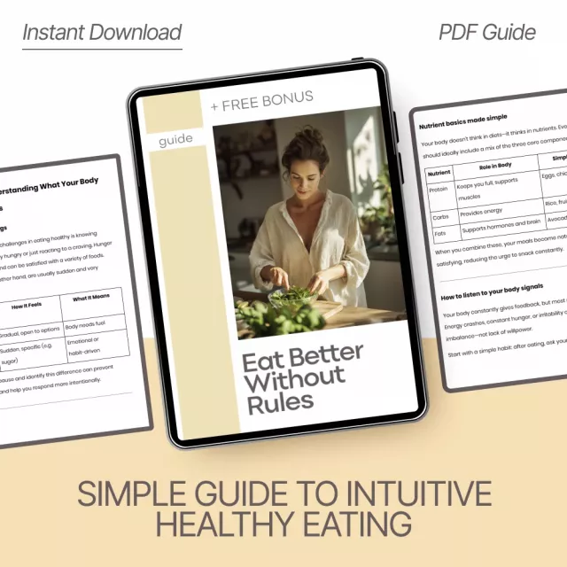 If you’re tired of strict meal plans, calorie counting, and feeling overwhelmed every time you try to “eat healthy,” this guide is your new starting point. Eat Better Without Rules is designed to simplify nutrition and help you build a confident, natural approach to food. Instead of telling you what not to eat, this guide shows you how to choose healthy food without dieting in a way that feels sustainable, realistic, and empowering.