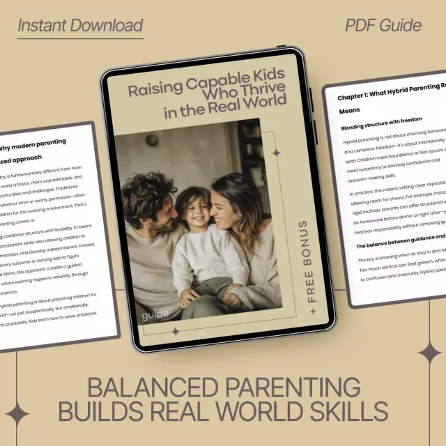 Parenting today can feel overwhelming—too much structure can limit growth, while too much freedom can leave kids unprepared. Raising Capable Kids Who Thrive in the Real World is your step-by-step guide to finding that perfect balance. Designed around a hybrid parenting style for real world skills, this digital guide helps you raise independent, resilient children who are ready to navigate life with confidence. Whether you’re a busy parent, homeschooling, or simply looking to strengthen your child’s life skills, this resource gives you clear, practical strategies you can start using immediately.